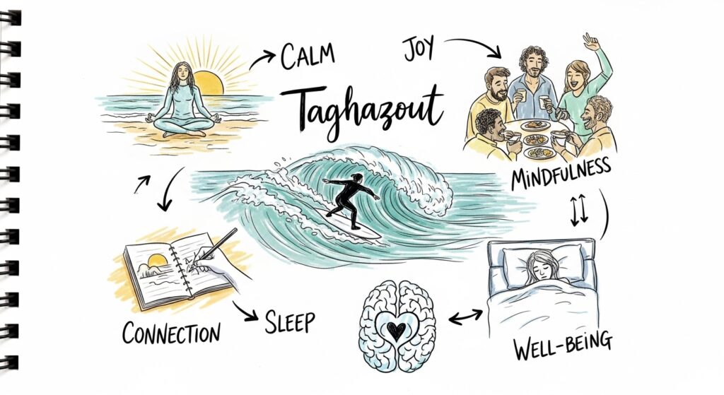Beyond the waves and the culture, there is something deeper that draws people back to Taghazout year after year. The ocean has a profound impact on mental wellbeing, and surfing amplifies it. The combination of physical exercise, immersion in nature, mindfulness in the lineup, and the simple joy of riding a wave creates a powerful reset for the mind.